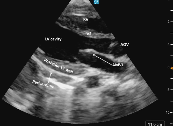 Figure 3: Parasternal long axis view in cardiology convention anatomically labeled.