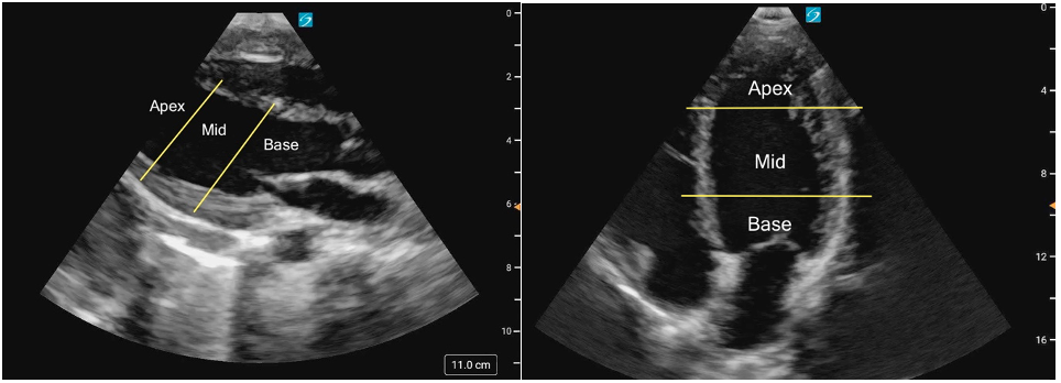 Figure 1ab: LV levels in the PLAX view (a) and A4C (b) in cardiology convention