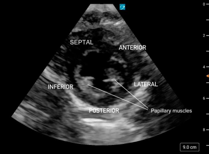 Figure 11. PSAX at the mid-papillary level with left ventricular walls labeled.