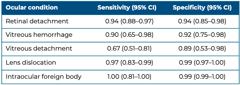 · Sonographic appearance: The appearance will vary depending on the amount of blood. It may appear as echogenic debris within the vitreous chamber, or a hyperechoic focus/membrane deep in the vitreous.