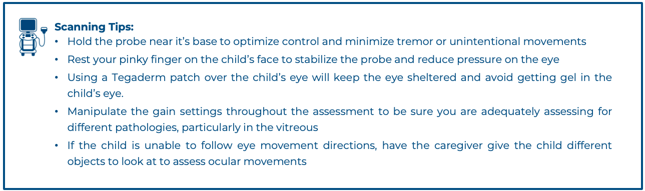 PoCUS can be used as an adjunct to assess pupillary response through closed eyelids using standardized light stimulation. It can be particularly valuable in pediatric trauma and critically ill children where direct assessment may be limited. Ultrasound assessment has shown excellent agreement with clinical examination for pupillary light reflex, including direct and consensual responses (ICC 0.93–0.96; agreement 87.36%) [28].